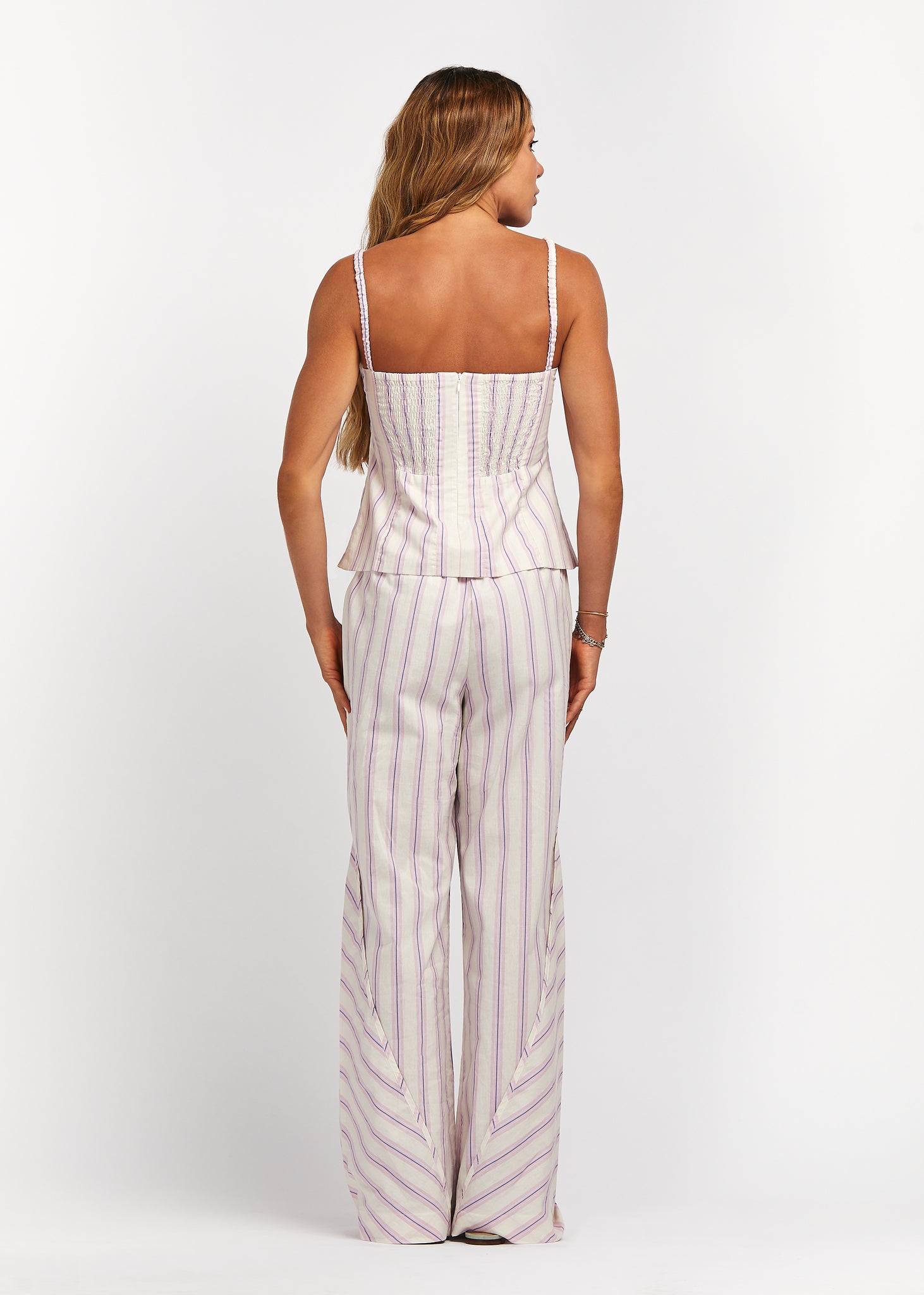 Calça estilo alfaiataria. Cós de elástico. Detalhe na barra. Bolso faca na lateral.