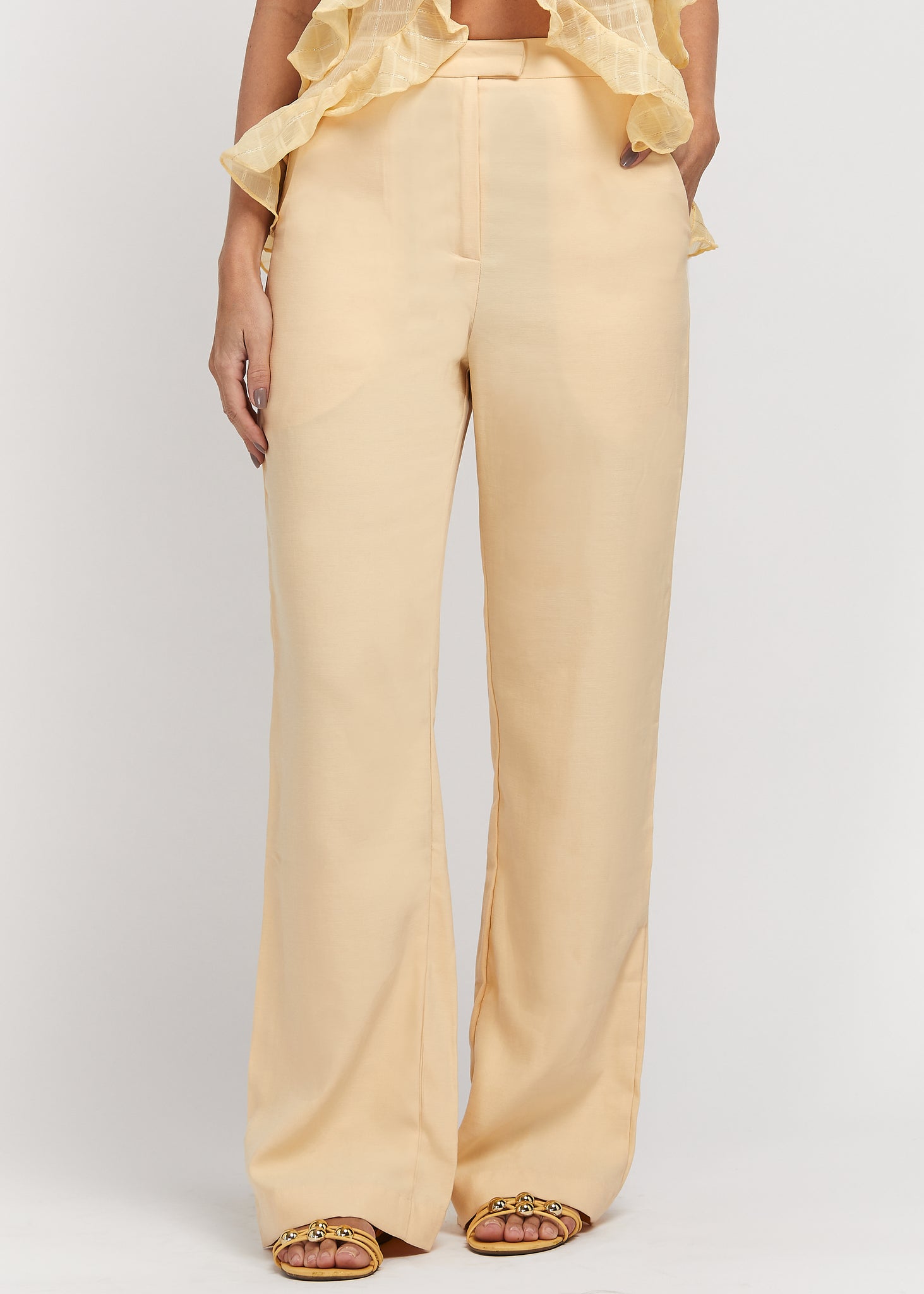 Calça em alfaiataria. Fechamento frontal por colchete. Bolsos na parte frontal e posterior.