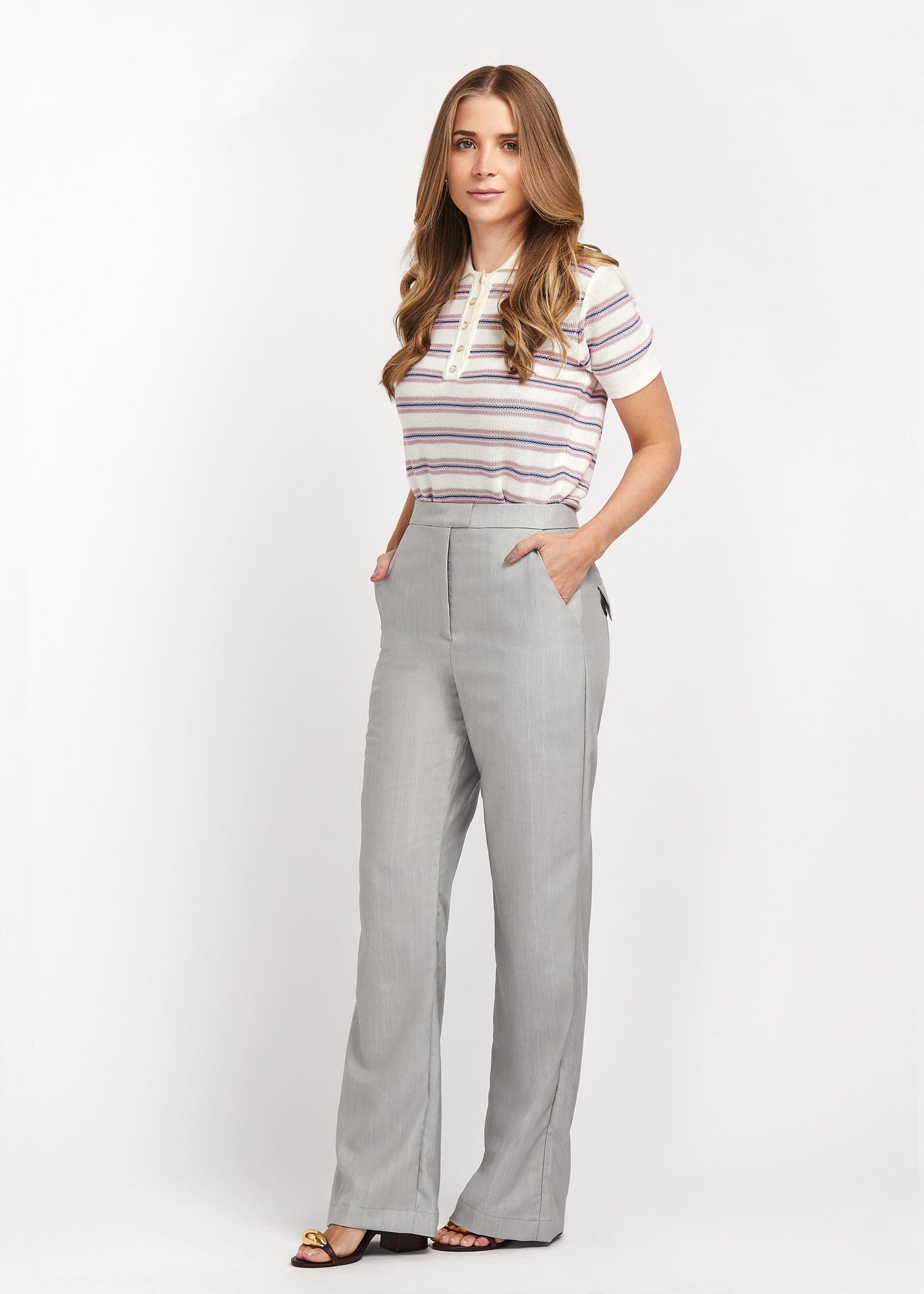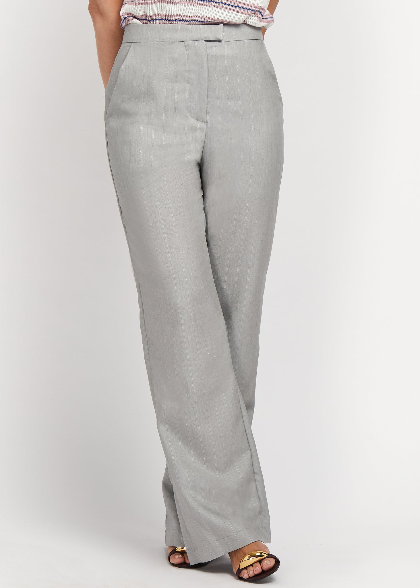 Calça em alfaiataria. Fechamento frontal por colchete. Bolsos na parte frontal e posterior.
